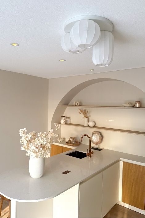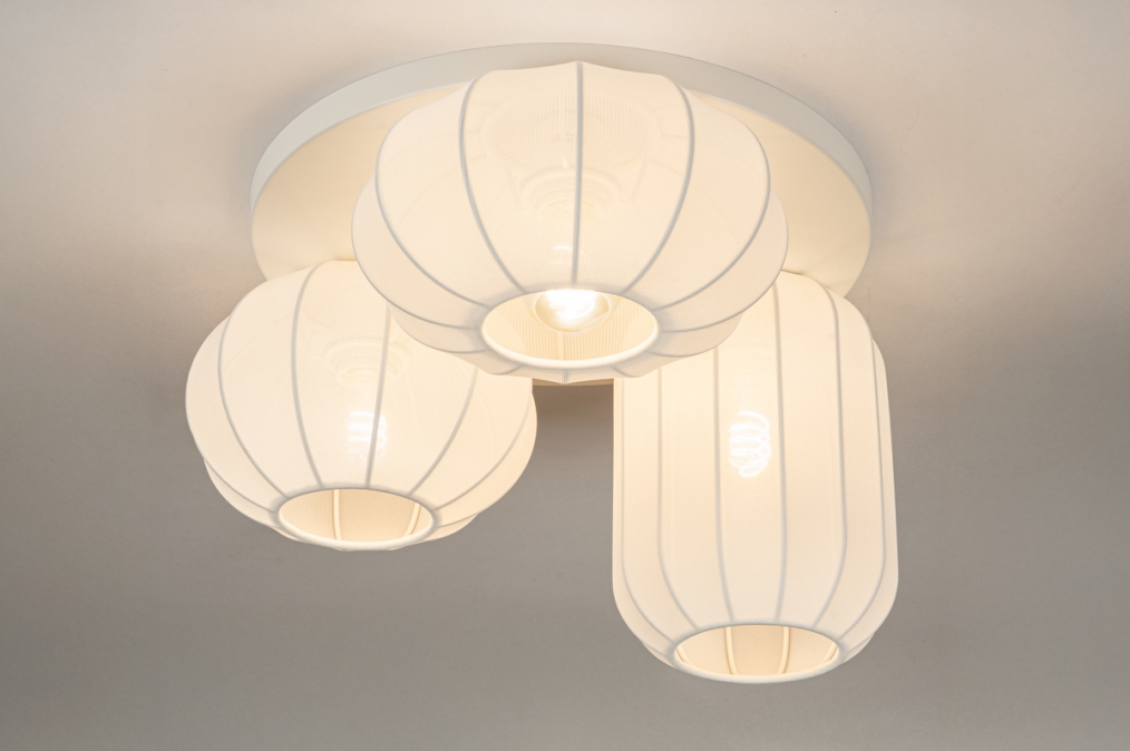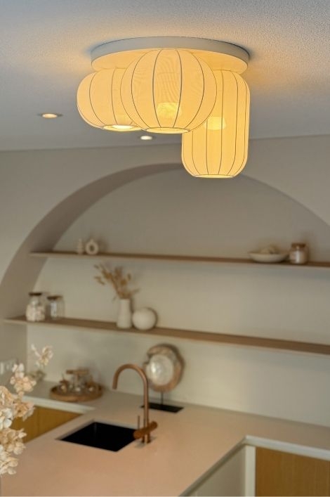 Diese wunderschöne Japandi Deckenlampe vereint modernes Design mit dem rustikalen Charme natürlicher Materialien. Die Deckenlampe hat eine runde Deckenplatte in der Farbe RAL9010 und besteht aus Metall, an dem drei einzigartige Lampion-Schirme angebracht sind. Die weißen Schirme, aus hochwertigem Stoff gefertigt, haben jeweils eine eigene Form: eine Kugel, ein Turban und ein Oval. Diese verspielte Variation sorgt für ein stilvolles und harmonisches Gesamtbild, das perfekt zu skandinavischen, rustikalen, ländlichen und Japandi-Innenräumen passt.Vorteile der großen Deckenlampe in Weiß
