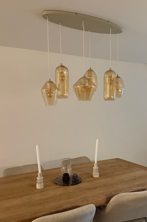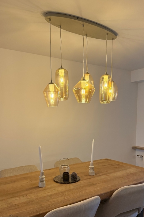 Diese einzigartige Hängelampe besteht aus einer ovalen, beigefarbenen Deckenplatte, an der sechs Gläser in verschiedenen Formen befestigt sind. Die Gläser sind leicht bernsteinfarben, eine sehr warme Farbe, die jedem Raum sofort eine gemütliche Atmosphäre verleiht. Die Farbe des Glases wird auch als Champagnerfarbe bezeichnet. Die Hängelampe wirkt sehr verspielt durch die verschiedenen Formen, die auch in unterschiedlichen Höhen hängen.Vorteile Glas-Pendelleuchte