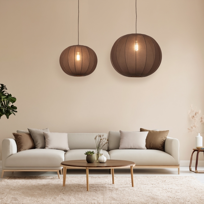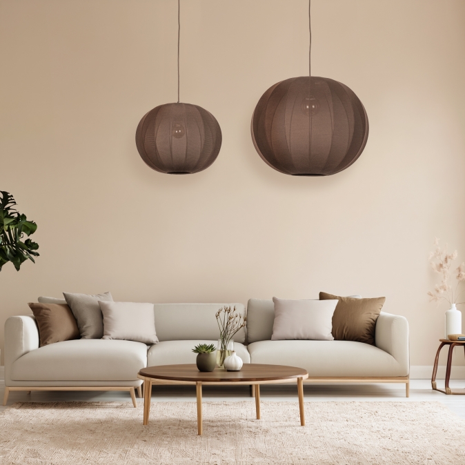 Groß, größer, am größten! In unserer sehr erfolgreichen Serie von Lampionlampen ist jetzt auch diese XL-Pendelleuchte erhältlich. Garantiert stimmungsvolles Licht und ein absoluter Blickfang in jedem Interieur! Diese braune Lampionlampe sorgt für ein angenehmes und sanftes Licht. Aufgrund ihrer einzigartigen und großen Größe eignet sie sich besonders schön über dem Esstisch, im Schlafzimmer oder in offenen Räumen wie einer Diele. Diese Kugellampen lassen sich auch hervorragend miteinander kombinieren sowohl in verschiedenen Farben als auch in unterschiedlichen Formen. Diese große Pendelleuchte ist aus einem schönen braunem Stoff gefertigt, der transparent ist und eine feine Streifenstruktur hat. Die runde Form, die typische Lampionstruktur und der hochwertige Stoff machen diese Lampe besonders stimmungsvoll, weich und rustikal.Vorteile der XL Lampion Pendelleuchte aus Stoff