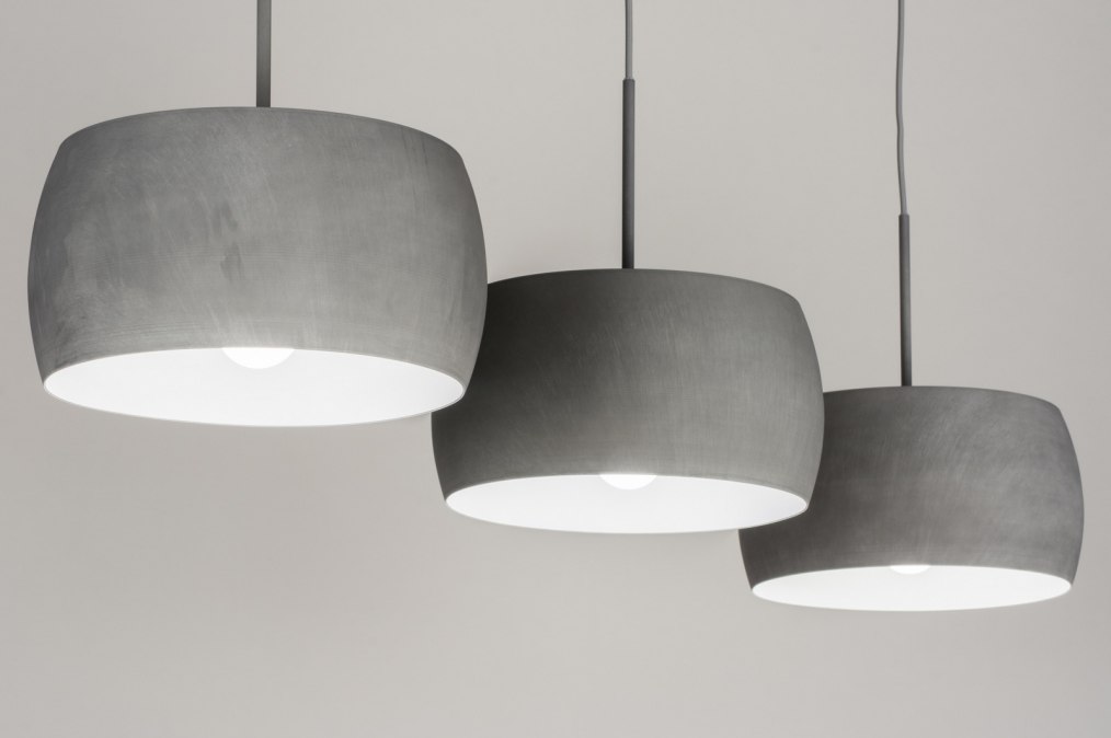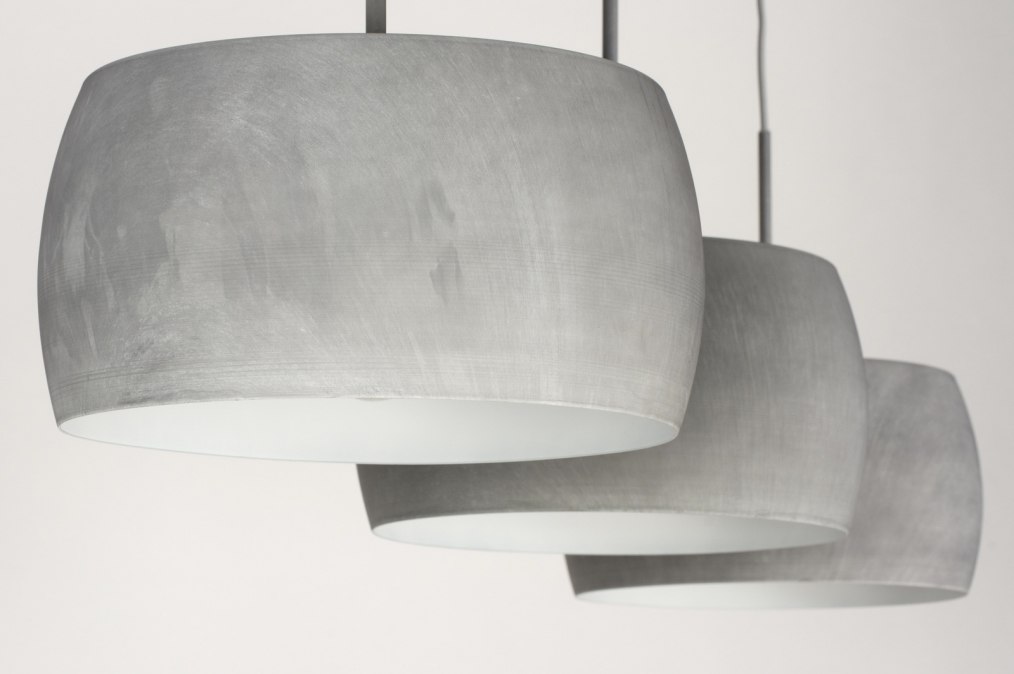 Skandinavisches Design zu einem attraktiven Niederländischen Preis. Für Liebhaber von skandinavischem Wohnstil ist diese 3-flammige Hängeleuchte ein Leckerbissen. Schlicht, klare Linien und Qualität. Durch die Betonoptik passt die Leuchte auch perfekt in eine ländliche oder industrielle Einrichtung. Die schönen Lampenschirme aus Aluminium sind in Betongrau gehalten und die Ober- und Unterseiten sind symmetrisch. Die Innenseiten sind auch in Betongrau gehalten (nicht weiß). Ihren Abschluss findet die Leuchte in einer schmalen Deckenleiste ebenfalls in der Farbe Betongrau. Hübsches Detail sind auch die grauen, im Bügeleisenkabellook gehaltene, Kabelschnüre. Durch die manuelle Bearbeitung der Farbe hat jede Lampe ihr eigenes, einzigartiges Aussehen. Keine zwei Lampen/ Lampenschirme haben genau die gleiche Oberfläche. Streifen und "Flecken" verstärken den Beton-Look!