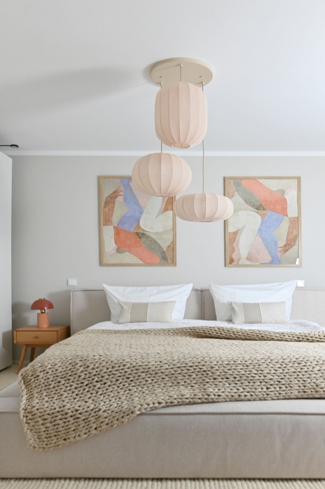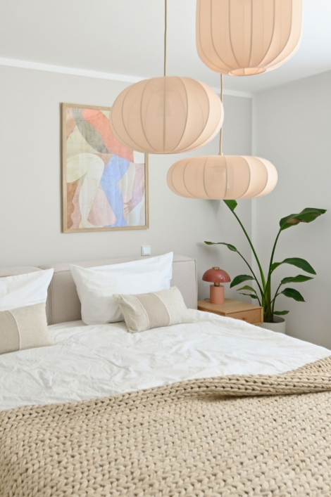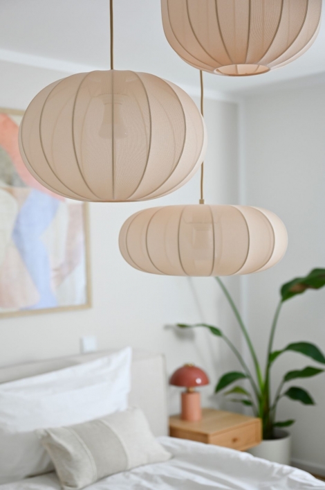 Lampionlampen sehen wir häufig in trendigen Wohnstilen wie Japandi und dem skandinavischen Stil. Lampions haben ein sanftes Aussehen. Diese Lampionlampe hat das gleiche sanfte Aussehen, wirkt aber durch den schönen Stoff (anstelle von Reispapier) noch etwas luxuriöser. Der warme Beigeton kann – je nach Leuchtmittel und Umgebungslicht – einen dezenten, fast pudrigen Unterton haben.Diese Doppel-Pendelleuchte eignet sich hervorragend über einem runden Esstisch, dem Couchtisch, neben dem Sofa (anstelle einer Stehlampe) oder im Treppenhaus. Wo hängen Sie diese Japandi-Pendelleuchte auf?