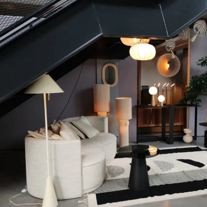 Diese Stehlampe strahlt Gelassenheit und Minimalismus aus. Der Stoff ist mit einer dezenten Faltenstruktur versehen, die für ein elegantes vertikales Linienspiel und eine weiche, handwerkliche Ausstrahlung sorgt. Sowohl der Schirm als auch der Fuß sind in derselben Cremefarbe gehalten, wodurch die Lampe ein harmonisches Ton-in-Ton-Gesamtbild ergibt. Schön in einer Zimmerecke, aber dank der schmalen Form auch perfekt neben einem Sofa oder Sessel!Vorteile dieser Stehlampe:
