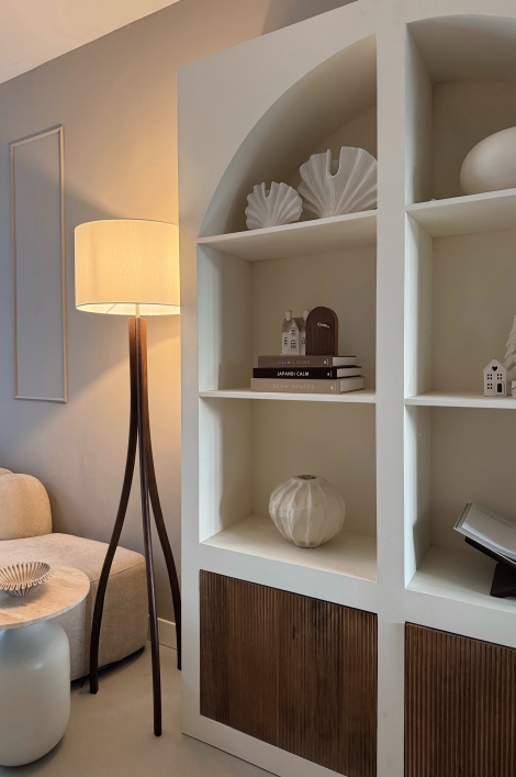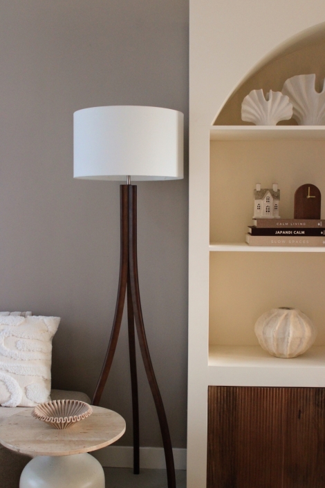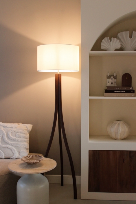 Mögen Sie auch natürliche Materialien in Ihrem Zuhause? Dann ist diese Stehlampe wirklich zum Verlieben. Die Stehlampe ist aus dunkelbraunem Holz gefertigt und hat eine schöne Walnussfarbe. Die organische Form des Sockels passt perfekt zu diesem natürlichen Material. Die drei Beine haben eine ovale (einzigartige!) Form und laufen oben an der Leuchte zusammen. Der weiße Schirm setzt einen stilvollen Akzent. Die Innenseite des Stoffschirms ist ebenfalls weiß und reflektiert das Licht.Vorteile der Stativlampe aus Holz