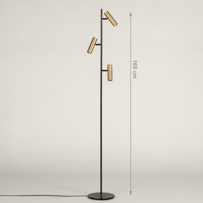 Schwarze Stehleuchte mit drei Strahlern in Messing