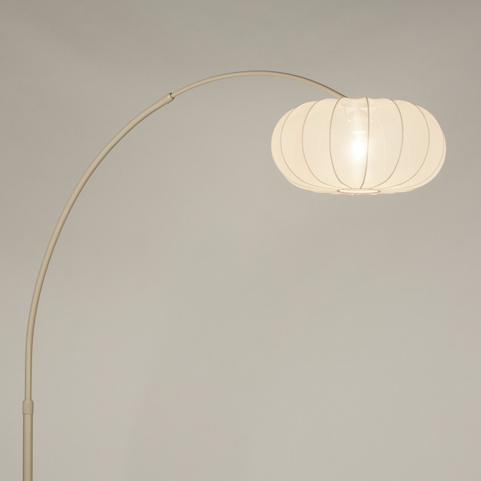 Sandfarbene Bogenleuchte mit beigem Lampionschirm